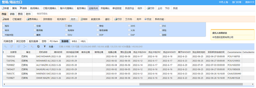 2022年初,中色上海公司启动了云海系统建设。半年以来,云海系统极大提升了物流工作效率,实现了两个方面的突破:一是数据集成,实现了《自主物流出口一览表》、《自主物流非洲动态表》、《海运订舱托单》、《物流费用确认书》的汇总导出以及自动计算物流业务利润的功能,员工只需将每票物流业务的信息录入到指定模块中,各个物流节点之间的数据可以实现“无缝衔接、一览无余”;二是集约查询,“码头海运一站式信息化”功能实现了从码头提空箱开始至海运开船结束,将上海洋山港、外高桥、上海海关、各个船舶公司的物流数据进行汇总,只需一键点击,每票货物在各阶段处于何种状态,便可一目了然,减少多个网站频繁查询的次数,提高物流工作效率;三是智能作业,通过“智能配载平台”,员工只需将中色国贸采购的货物清单上传至系统内,系统就会根据货物的尺寸与集装箱的标准容积、非洲车辆的标准尺寸自动进行配载计算,最终算出集装箱和非洲车辆的使用数量,从上传清单至结果展示仅用时5秒,而传统人工作业则需耗时1-2天,切实提升了前期的配载效率。