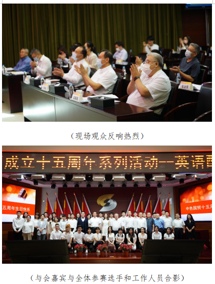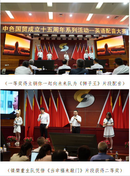2022年9月1日下午,中色国贸成立十五周年系列活动——“栉风沐雨十五载,砥砺奋进谱新篇”主题英语配音大赛决赛在三层会议室隆重举行。集团公司党委副书记孔繁新出席决赛为冠军队颁奖并作点评讲话。决赛还特邀中国国际广播电台英文主播、英国剑桥BEC口语考官赵壮女士进行了专业点评。