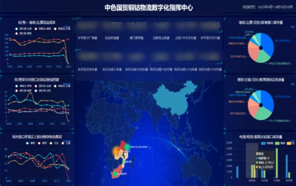 在国际物流信息获取中存在“数据杂、节点多、统计难、人员广、时差大”五大难题,为更好解决这一困境,切实提升决策时效性和精准性,全力保障铜钴产品回运,新扬公司物流团队立足管理创新,依托中色国贸数字化战略,积极探索数智化转型路径,2024年度成功构建“中色国贸铜钴物流数字化指挥中心”。在物流数智化管理方面,深挖数据价值,分析铜钴产品港口库存情况,并建成可视化数字交互系统,实现南北双向库存管控、运输监控、数据分析、风险预警及可视化展示等功能,推动贸易库存压降和物流一站式管理。在物流效率提升方面,通过车辆资源调配和库存智能监控,截至2024年底,铜钴产品在途库存同比降低了24%,物流上船交付效率同比提高了18%;2025年1—5月,多地运输周期再创新优,提货量同比增长4.9%;交付量同比增长12.42%。在服务质量有所提升的同时,增强了供应链韧性和运营效率,逐步构建智慧物流新生态,切实增强公司核心竞争力。