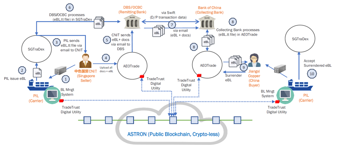 二是验证可行性,掌握电子提单“试金石”。验证了电子提单在铜产品贸易中的可行性,通过基于信贸链和TradeTrust的平台进行单据真实性核验,代收行通过平台直接验单,并能够在线进行权属转移,显著提升跨境贸易融资安全性与效率。