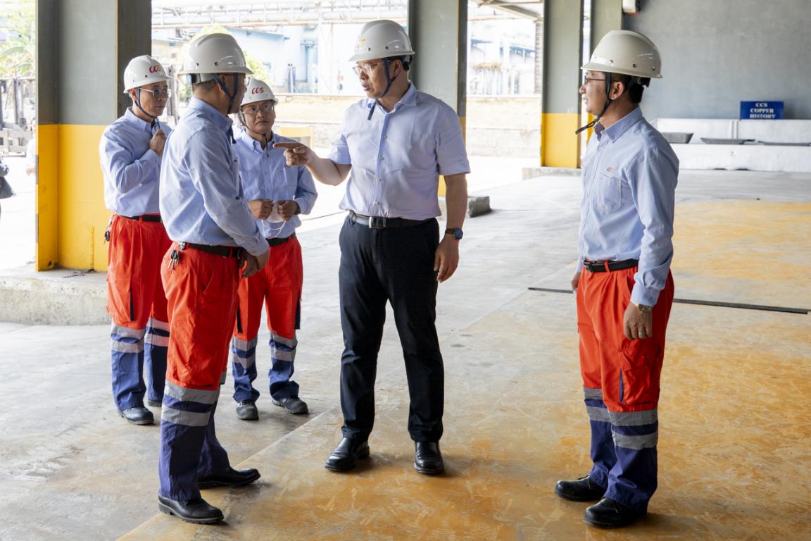 在谦比希铜冶炼,奚正平董事长一行参观公司展厅、办公区,现场调研熔炼分厂转炉渣临时存放点、铜产品堆场和3号阳极炉,边调研、边提问、边指导,就公司如何践行“1+4”发展战略提出了具体工作意见。