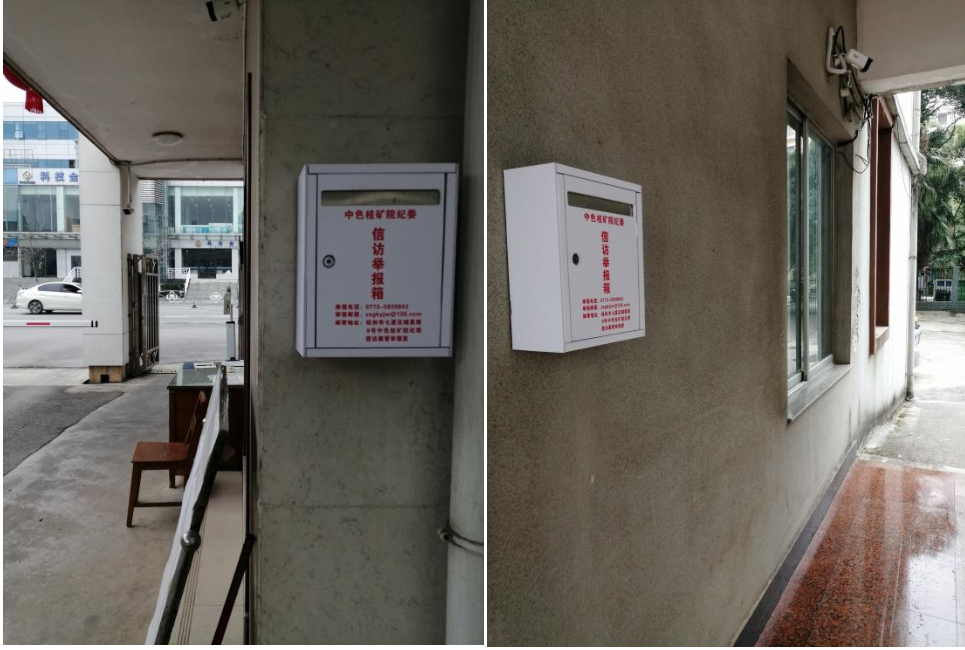 基地在办公楼一楼大厅食堂墙面(无监控)设立一个信访举报箱。如下图: