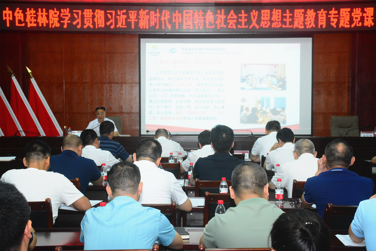 6月29日上午,中色桂林院党委召开学习贯彻习近平新时代中国特色社会主义思想主题教育专题党课会议。党委副书记、总经理杨国高以《全面贯彻落实习近平新时代中国特色社会主义思想,奋力建设中色桂林院“双一流”科研院所》为题,结合前期的理论学习、调查研究和自身思考,为广大党员干部讲授主题教育专题党课。中国有色集团第一巡回指导组副组长马月龙,组员王伟强到会指导。公司党委委员、纪委书记高贤明主持会议。