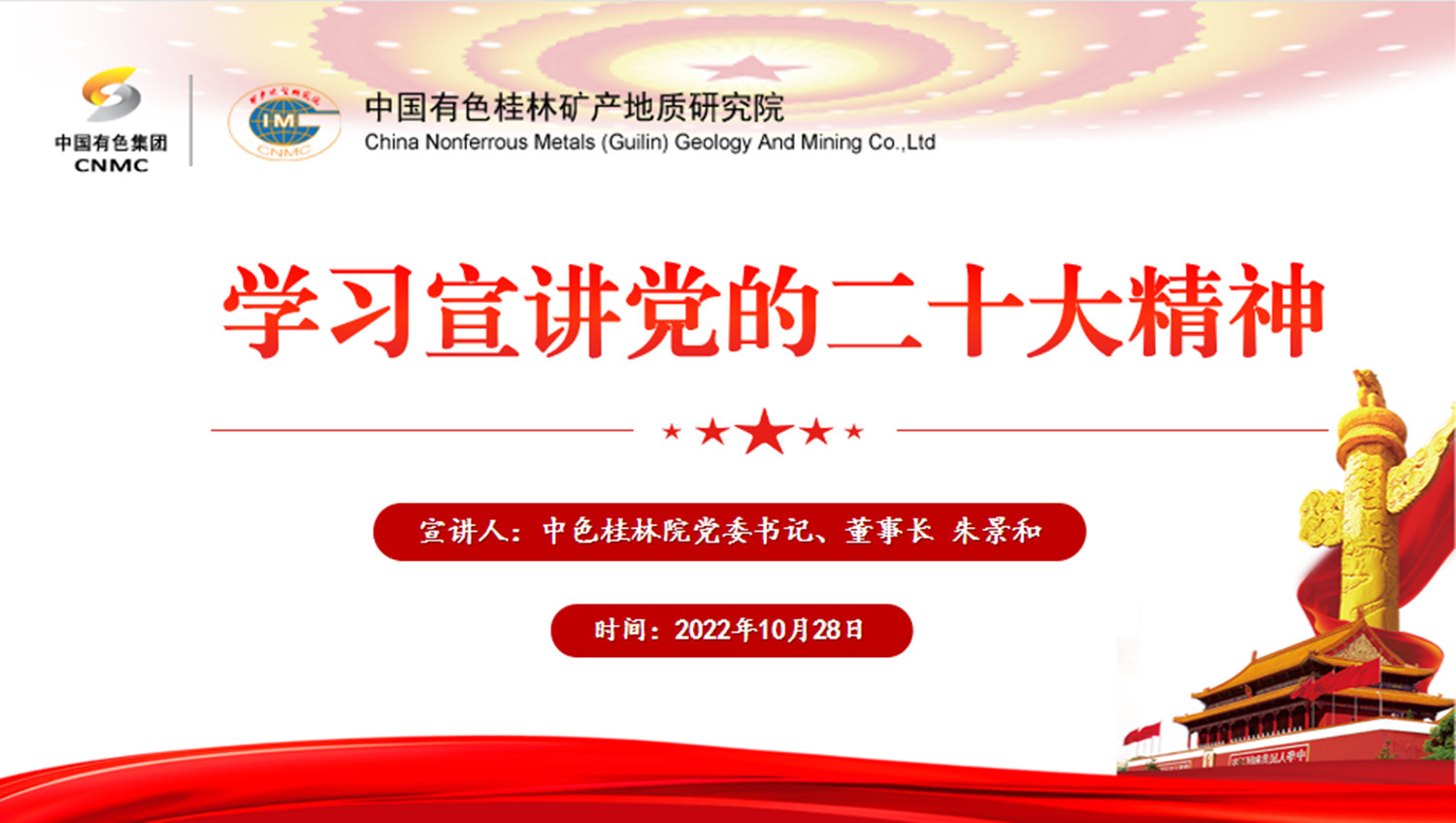 朱景和强调,我们要在党的二十大精神指引下,以“时不我待”的紧迫感、“舍我其谁”的责任感、“功成有我”的使命感,全身心投入到推动中色桂林院高质量发展的各项事业中去。一是要提高政治站位,把思想和行动统一到党中央、习主席决策部署上来。公司党委要提高政治站位,进一步精心谋划、全面部署,着力推动学习走深走实。二是要把握根本要求,学懂弄通做实习近平新时代中国特色社会主义思想。公司党委要按照党中央和上级党委的部署要求,组织开展好学习培训、集中宣讲、新闻宣传和知识竞赛等各项工作,把学习成果转化为谋划工作的强大动力,推动党的二十大报告精神在公司高质量发展的各项工作中落地生根、开花结果。三是要坚持改革创新,以担当实干精神不断推动中色桂林院高质量发展。要充分发挥中色桂林院科研优势、平台优势、人才优势和“桂林院10条”利好政策,坚持改革创新,深耕科技创新,加强人才培养,坚持“空谈误国、实干兴邦”,守正创新、勇毅前行,全力冲刺第四季度,科学谋划好明年工作,把党的二十大精神转化为推动高质量发展的动力。四是要加强自我革命,坚持“严”的主基调把全面从严治党向纵深推进。今年以来,公司党委纪委开展全面从严治党会商3次,开展“一把手”谈话36人次,紧盯工程项目管理、科研经费管理、物资设备招标采购等开展检查,一体推进“三不腐”体制机制建设,确保公司政治生态“风清气正”。