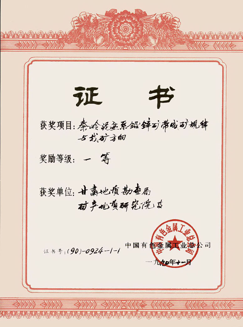 中国有色金属工业总公司科技进步奖一等奖-1990年