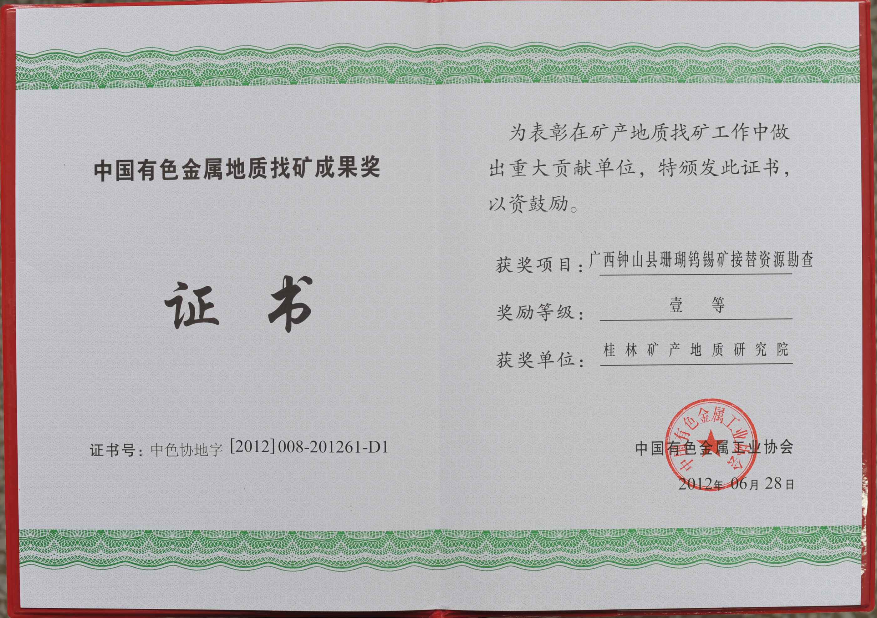 中国有色金属地质找矿成果奖一等奖-2012年