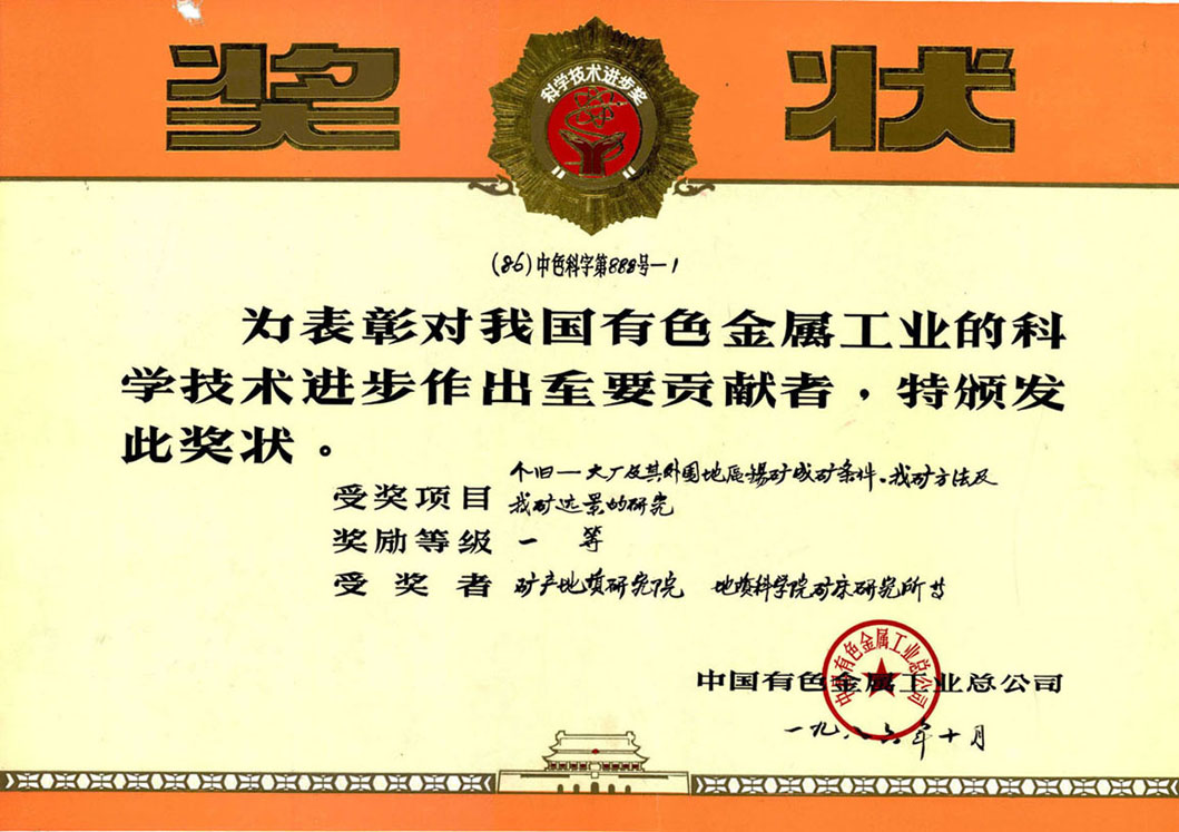 中国有色金属工业总公司科技进步奖一等奖-1986年