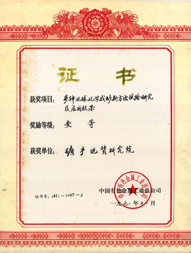 中国有色金属工业总公司科技进步奖一等奖-1992年