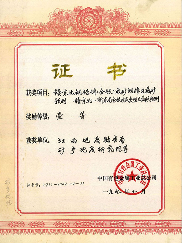 中国有色金属工业总公司科技进步奖一等奖-1991年