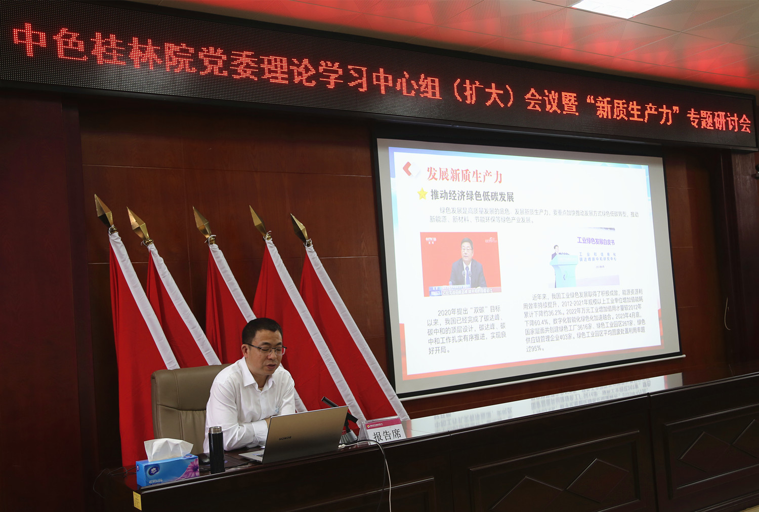 为进一步激发科技创新活力,坚持以科技创新引领发展新质生产力,推动桂林院不断开辟高质量发展新领域新赛道,3月29日,中色桂林院召开党委理论学习中心组(扩大)学习会议暨“新质生产力”专题研讨会,深入学习贯彻习近平总书记关于新质生产力的重要论述,围绕“如何加快培育和形成新质生产力,增强发展新动能”开展研讨交流。中色桂林院党委书记、董事长、总经理杨国高出席会议并作总结讲话,党委委员、副总经理胡乔帆主持会议并作中心发言。
