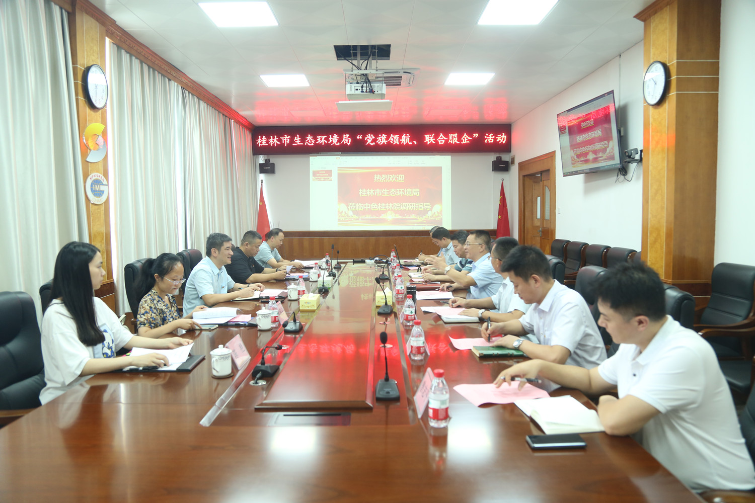 8月6日上午,桂林市生态环境局副局长熊小斌一行到中色桂林院开展“党旗领航 联合服企”走访调研活动,并进行座谈交流。中色桂林院党委书记、董事长、总经理杨国高、党委委员、副总经理赵延朋热情接待了熊小斌一行。中色桂林院党群综合办、安全环保部、生态环境事业部、测试中心负责人参加座谈会。